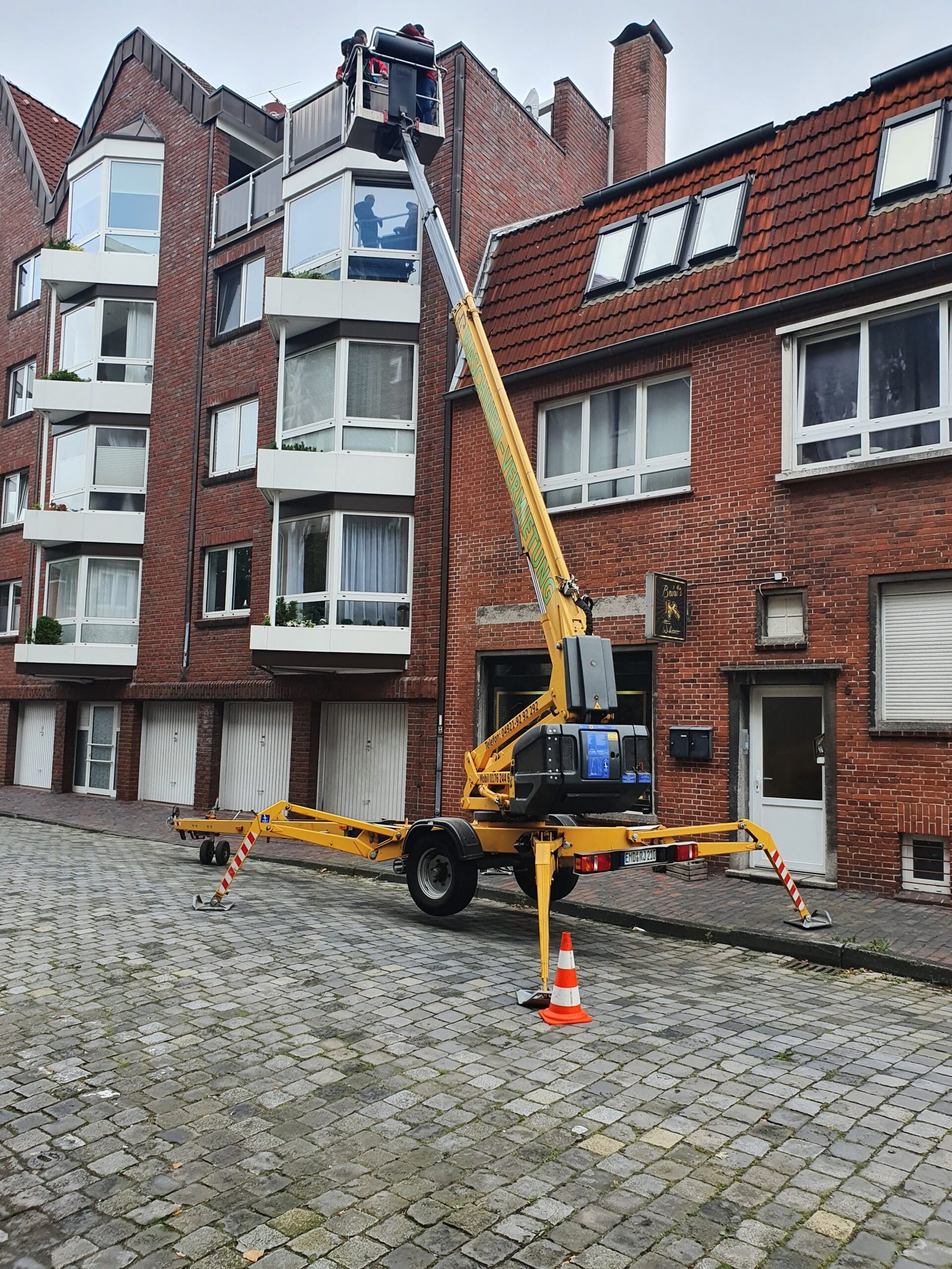 Gelenk- und Teleskopausleger: Dank der Gelenk-Teleskop-Konstruktion kann die Bühne flexibel über Hindernisse (z. B. Dächer, Vorsprünge, Bäume) hinweg eingesetzt werden — ideal z. B. für Fassaden-, Dach- oder Baumpflege-Arbeiten. schaumeier-hebebuehnen.de+2Dinolift+2